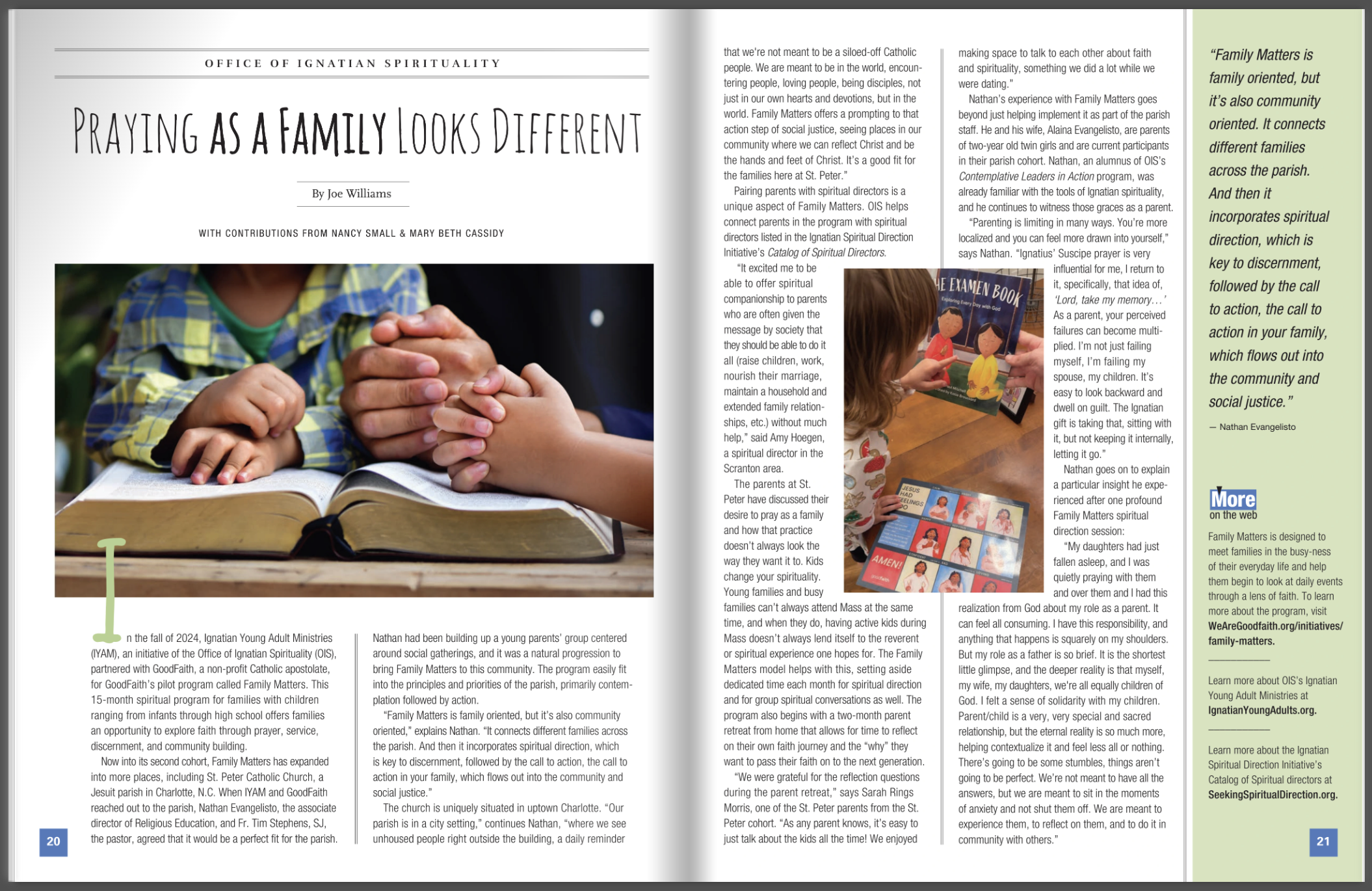 Nathan’s experience with Family Matters goes beyond just helping implement it as part of the parish staff. He and his wife, Alaina Evangelisto, are parents of two-year old twin girls and are current participants in their parish cohort. Nathan, an alumnus of OIS’s Contemplative Leaders in Action program, was already familiar with the tools of Ignatian spirituality, and he continues to witness those graces as a parent.
